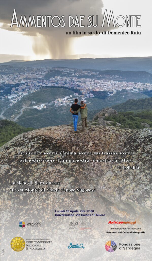 Nell’ambito del corso di Geografia (docente Matilde Schirru), lunedì 16 aprile si terrà un seminario dedicato al concetto di Luogo, che vedrà la partecipazione straordinaria del fotografo e documentarista nuorese Domenico Ruiu che proporrà il suo Ammentos dae su Monte. Il documentario è dedicato al Monte Ortobene, paesaggio simbolico e spazio di memoria profondamente radicato nell’identità della comunità nuorese.